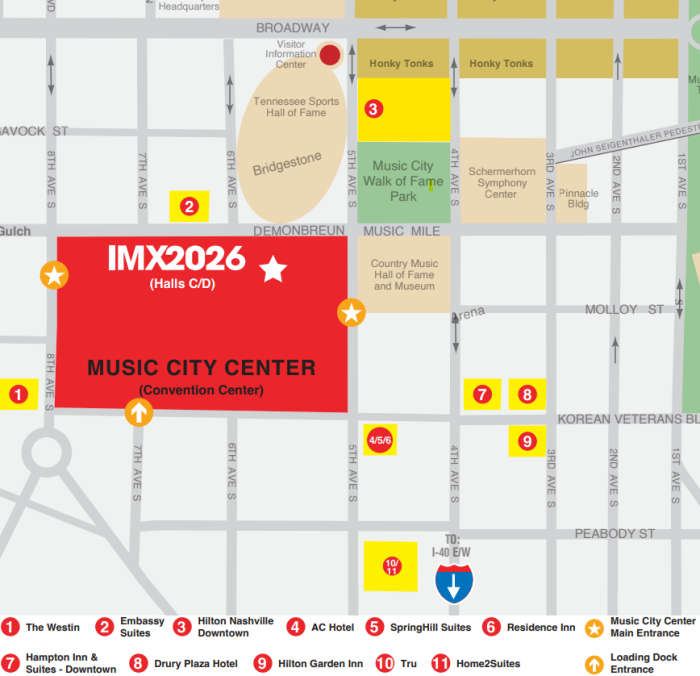 The IMX team has secured discounted hotel rates for 2026 attendees, exhibitors, speakers, and sponsors. All hotels in the official #IMX2026 room block will be within walking distance of Music City Center. NOTE: We will never reach out to you to make a hotel reservation within an “official IMX block” or to try to sell you an attendee list. Please do not work with anyone offering these services.